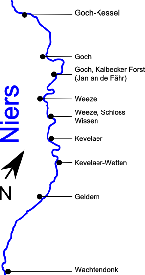 Unsere Start- bzw. Zielorte für Bootsfahrten auf der Niers (von der Quelle Richtung Mündung) sind Geldern, Wetten, Kevelaer, Weeze-Schloß Wissen, Weeze, Goch-Kalbecker Forst (Jan an de Fähr), Goch und Goch-Kessel.